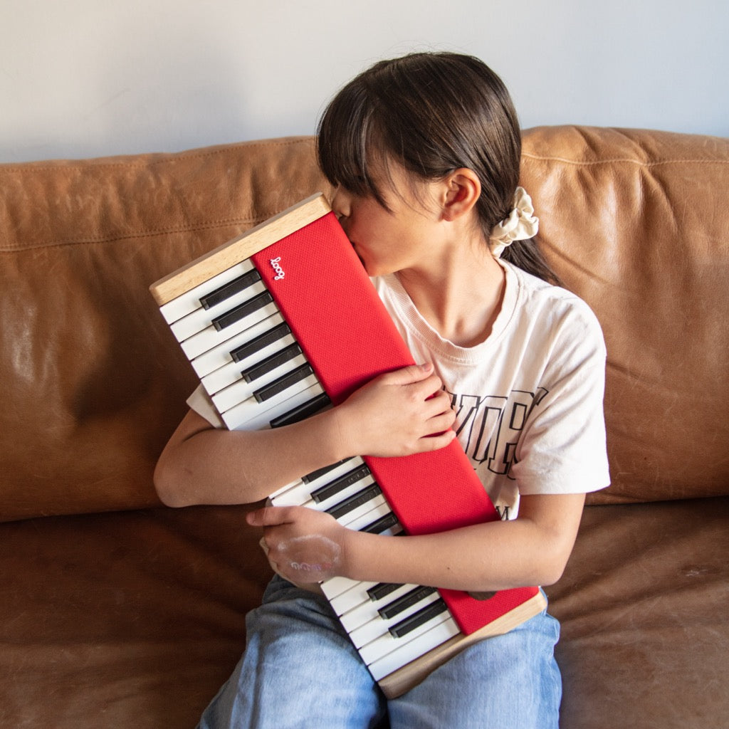 The Loog Piano has a synth-action keyboard, providing a lighter (and more suitable for beginners) playing action than a typical hammer action keyboard.